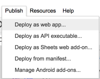 Publish the web app. In the Script Editor, go to Publish –> Deploy as web app. This will open the dialog box for deploying the script as a web app.